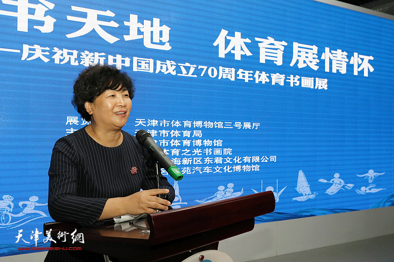天津市体育局党委书记、局长李克敏在致词中表示,天津是一座历史文化名城,也是书画艺术名城。此次展览中,书画名家和体坛精英、奥运冠军通过自己的作品展示了体育和艺术的风采,展示了70年来体育和艺术发展的成果,是体育和艺术融合发展的最好表现。为庆祝新中国成立70周年,市体育局还将推出集邮文化展、天津女排纪录片、“70年70人”等系列活动,展示70年来优秀体育工作者做出的重要贡献。体育博物馆所在的民园体育场曾有百年历史,如今已成为市民休闲健身的乐园和城市文化客厅。在体育博物馆里,市民可以了解天津悠久的体育文化历史,是我们展示文化自信的最好方式。在国家体育总局文化中心和天津市文化和旅游局博物馆处的大力支持下,天津市体育博物馆成为全国最具特色的体育博物馆和天津市爱国主义教育基地,每年还会接待众多外国友人。国内外观众通过这一窗口,可以看到天津悠久的历史和近代文明。近代历史看天津,近代体育也要看天津,天津是中国体育的发祥地,也是中国奥林匹克的摇篮,有着悠久的体育文化历史和深厚的体育文化积淀,天津体育人会继续努力,在新时代做出体育人应有的贡献。希望通过此次展览,唤起社会各界对体育的热爱,让我们的城市更加健康文明、充满活力,让体育成为天津经济社会发展的强大精神动力,让更多人享受体育和艺术融合的无限魅力。