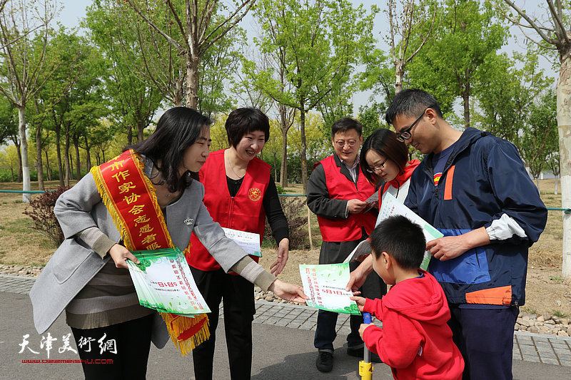 天津画院办公室主任张春燕、天津画院专职画家孙飞、汪洋,天津市作协李艳在水西公园向广大市民分发《天津市文明行为促进条例》宣传页。
