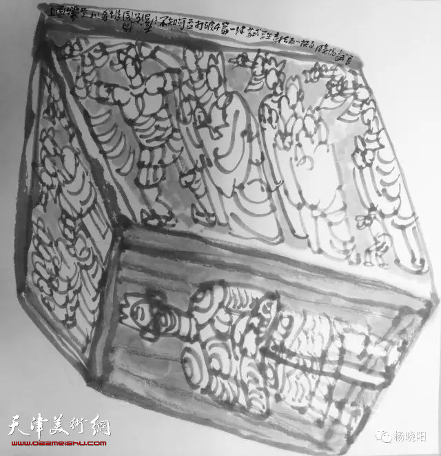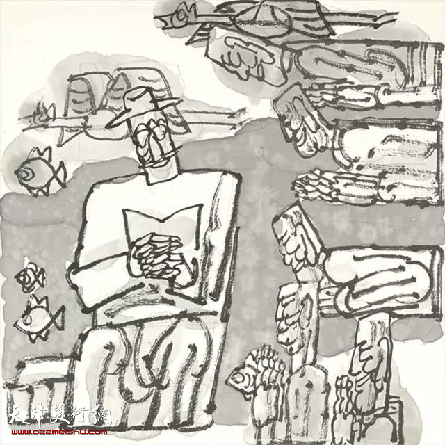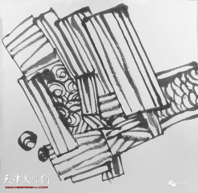 大约从2000年开始,杨晓阳开始着重致力于写意水墨画的探索和研究。他的大量速写为其水墨画实践奠定了风格上的基础。尤其是他近些年在造型上日趋简洁、概括,甚至呈现出几何化、程式化趋向,这对于艺术家来说,是一个从复杂、绚烂走向简括、平淡的过程,也是一个艺术家成熟的标志。也正因此,他的水墨画不仅在造型上进行了大跨度的变形,而且在构图上具有了平面构成的意味。这种表达方式看似吸收了现代艺术的因素,实际上是对中国传统造型方式的现代演化,其中包含了青铜器、汉画像石和诸如西北栓马桩这样的民间艺术等方面。更让我们注意的是,在依照中国传统造型法则吸收现代艺术形式语言的同时,他的水墨画仍然遵循了传统中国画以书入画的原则,将书法用笔揉入线条之中,使之画面更具变化和韵味。特别是他的石鼓和魏碑笔法不仅增加了线条的厚重和力度,也与他的古拙的造型相吻合。这些都体现了他题材模糊化、主题多义化、造型意象化、章法多维化、用笔书法化的艺术追求。杨晓阳也因此而在当代水墨艺术家中独树一帜。他清晰的四个段落表现出一种不断超越自己的艺术家的轨迹,给我们以深刻的启示。
