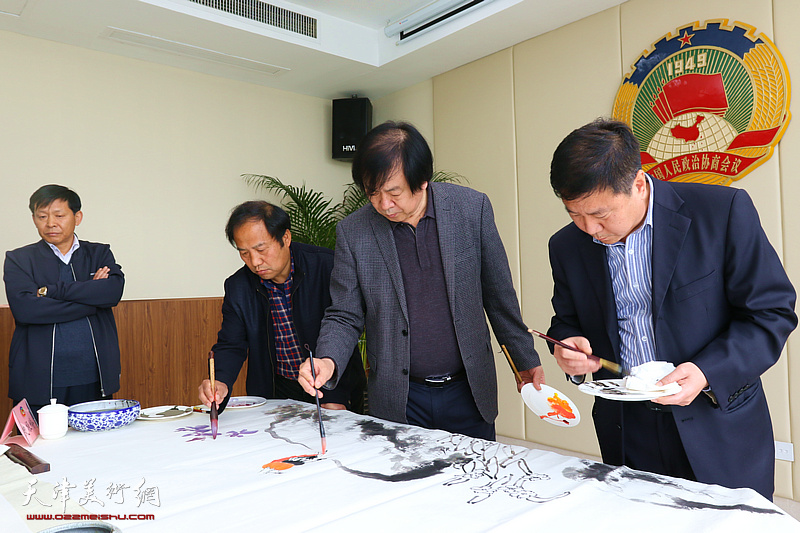 史瑞杰、窦双菊、李锋在活动现场观看史振岭、刘旭东创作。
