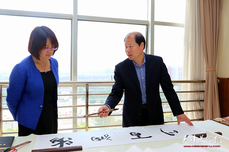 窦宝铁向史瑞杰、窦双菊介绍书法艺术。