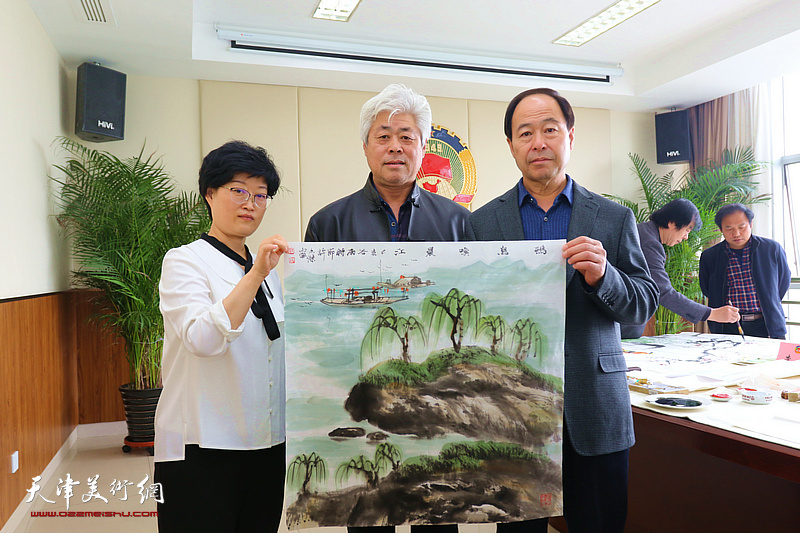 史瑞杰、窦双菊、崔悦平在活动现场观看孙友升创作。