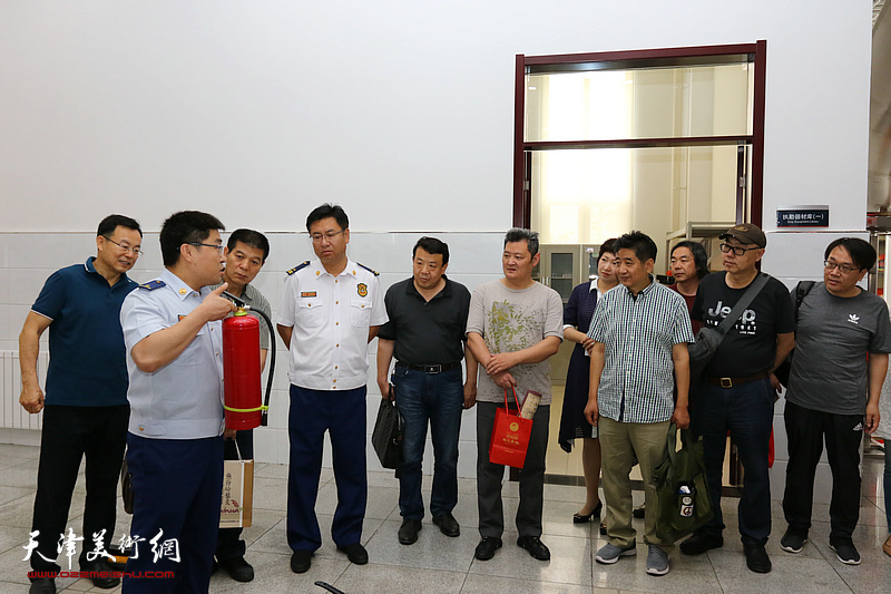 消防指战员向天津画院一行介绍新型灭火器的使用方法。