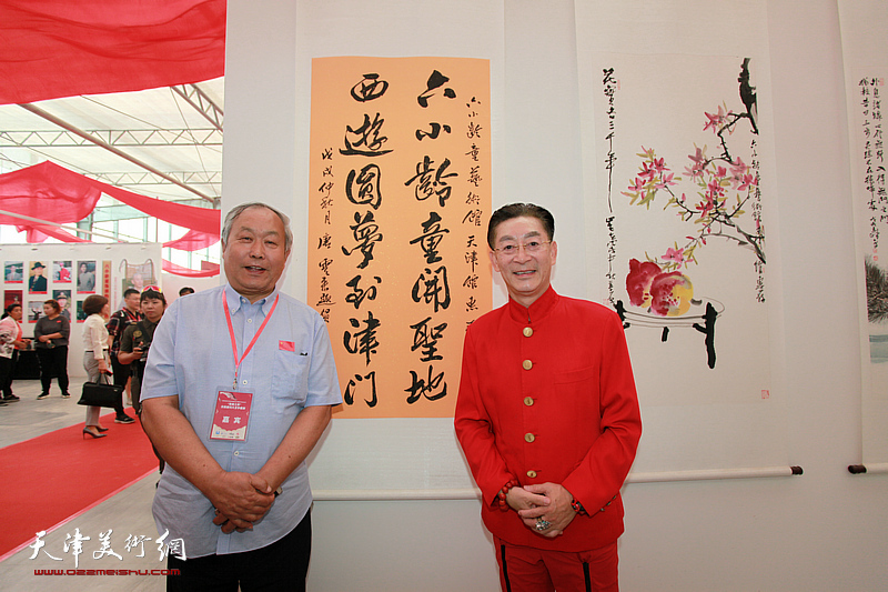唐云来、六小龄童在唐云来书法作品“六小龄童开圣地、西游圆梦到津门”前。