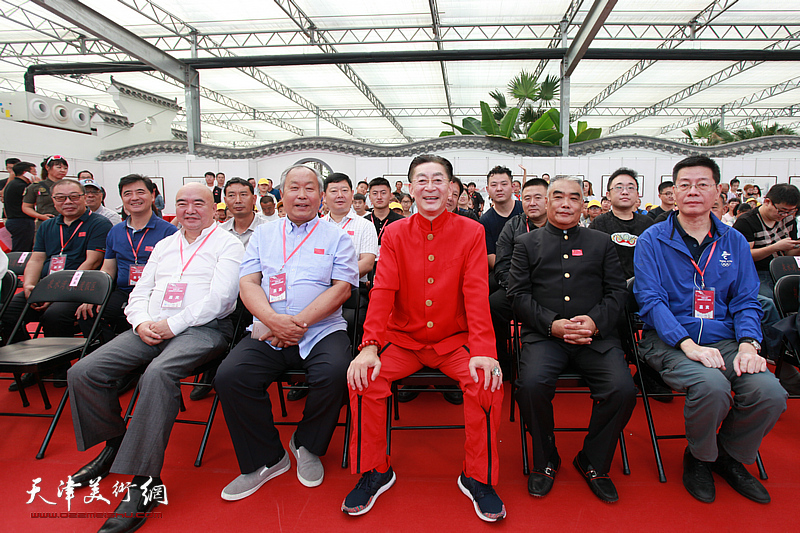 国家一级演员、著名表演艺术家六小龄童,天津市书法家协会第三届主席、著名书法家唐云来,著名学者、书画家、南开大学教授、博士生导师、南开大学书画艺术与美学研究院副院长、西游书画院院长尹沧海,六小龄童艺术馆天津馆馆长林德谦,辽宁出版集团党委副书记赵庆国,北辰区西堤头镇党委书记李国春,辽宁北方期刊出版集团有限公司党委书记、董事长、总经理杨志军,北辰区西堤头镇赵庄子村党总支书记、主任赵绍军共同为渔文化书画鱼拓艺术展的开幕剪彩。