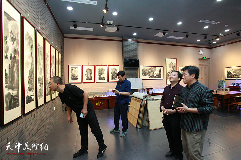 吴亚力、杨贵玉、王智勇、张旭在画展现场观看作品。