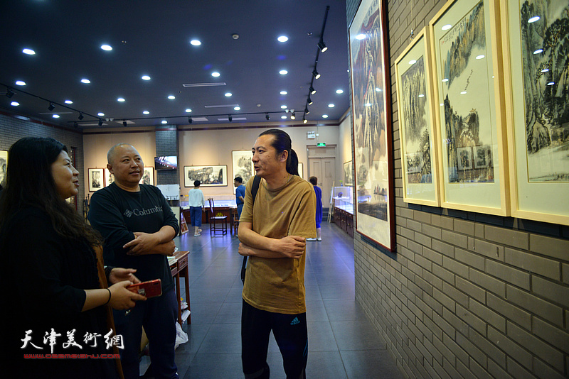 吴亚力、杨贵玉、张旭在画展现场交流艺术。