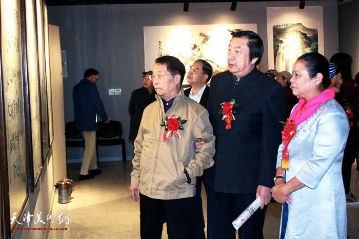 韩文来、孙玉河、于競、邢爱平、王洪春观赏展出的作品。
