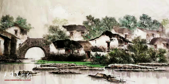 说到题材,郭凤祥老师这十几年主要喜画江南水乡,走访了周庄、乌镇、安徽宏村、皖南等水乡并进行写生,绘出的景致经常是小桥流水、老树人家,在烟雨蒙蒙中很有味道,看到郭老师的画,就仿佛融入到当地幽静闲雅的诗意生活中。在绘画中,郭凤祥老师在水墨中融入水彩,中西结合,别有趣味,给水墨画带来创新之处。举例来说,在画完一幅水墨后,在点染画的时候,郭凤祥老师发现石绿总是那么亮,过于跳脱整幅画的意境,经过不断和名家切磋顿悟,加上赭石后,色彩自然踏实下来,恢复了水乡的恬静安然。