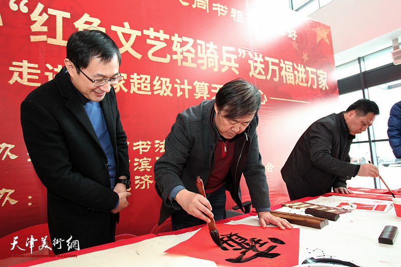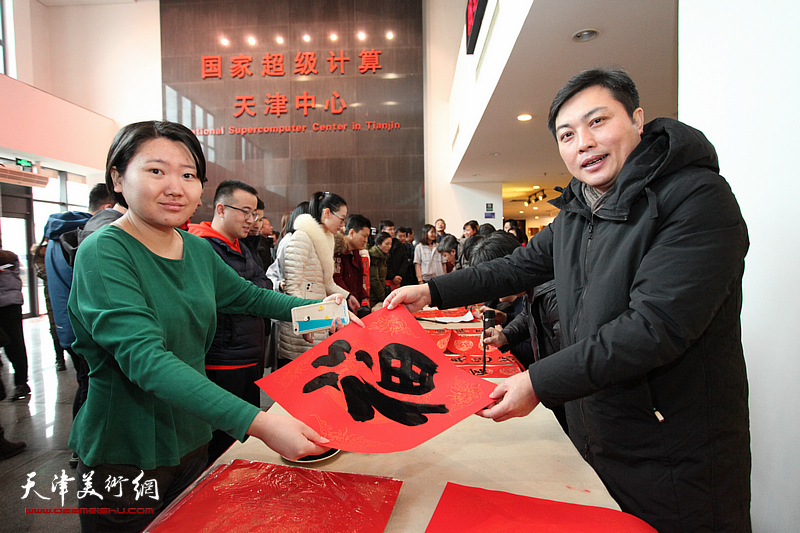 张建会说,本次书法文化惠民公益活动,通过写春联、送“福”字的形式,为天河科技园国家超级计算天津中心的广大职工营造健康喜庆、祥和向上的文化氛围,送上节日的祝福。计算是搭起新一代信息技术与新旧动能转换之间的桥梁,而超级计算作为大国重器更是大科学计划和大科学工程的加速器,是促进科技创新的最强大脑。所以,此次活动也是广大书法工作者向滨海新区广大干部职工学习的好机会。通过这次活动的开展,我们能够从超级计算的前沿一线,撷取养料、汲取创作素材,努力创作出更多贴近群众、贴近生活的优秀书法作品。