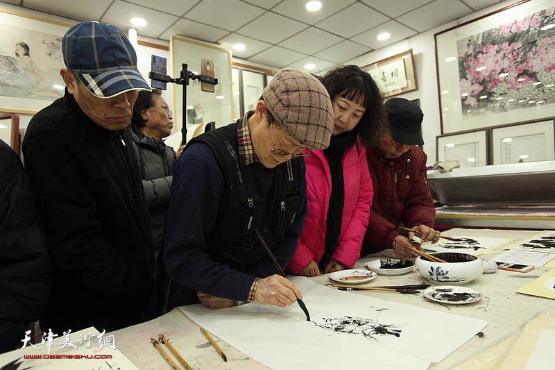 ·王惠民、彭英科、李根友在鹤艺轩创作大幅花鸟画作《素艳含芳》