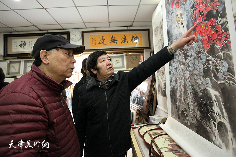 王惠民与郭凤祥在画展现场观看作品。