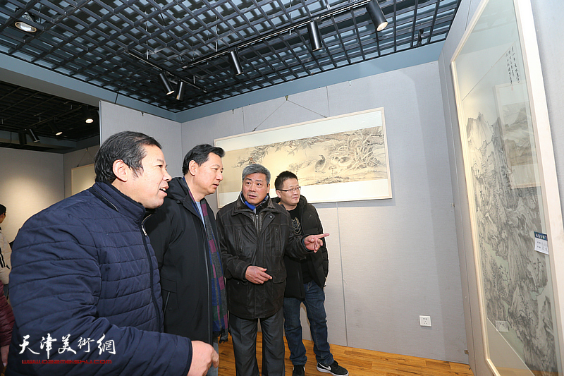 史振岭、张运河、刘义军、孙文龙在画展现场观看画作。
