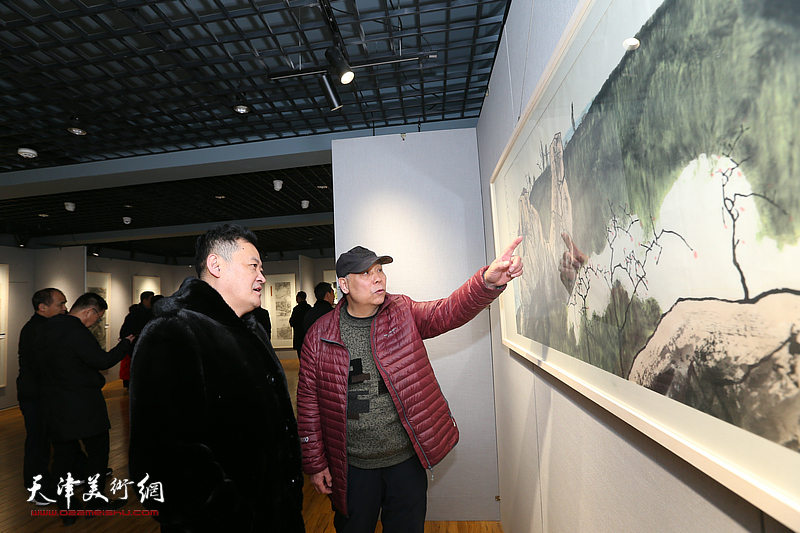 张运河、张福有在画展现场观看画作。