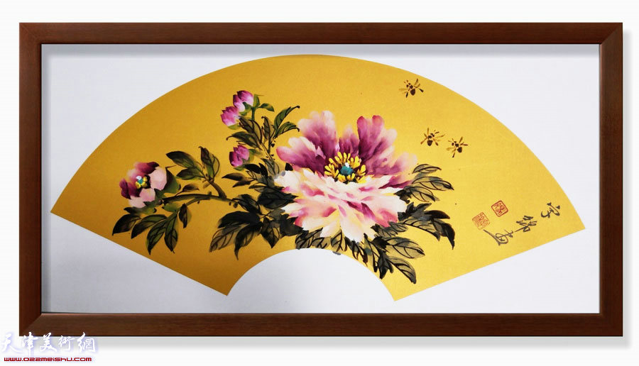 在与冯老师的交流中,得知她就是著名艺术家张锡武先生的儿媳,近水楼台先得月,冯老师跟随公公悉心学习牡丹画的各种高难度技巧,并融入了她自己对中国画牡丹艺术的理解和创新,如今终于形成她自己的独特艺术风貌。我们再来品读冯字锦老师的牡丹,除去气韵生动,用笔流畅外,我还看到冯老师的笔墨技法独出心胸,其笔墨线条出神入化,而且她的作品里也包含很多其它因素在其中,有岭南撞粉技法,也有没骨、写意的自由奔放,加之她的赋彩巧妙配搭,使其画中绿叶鼎托花蕊,枝干婷婷哉,牡丹花瓣的层次丰富清晰,构图饱满之至,胭脂层层渲染花瓣,浅黄点蕊、花青染叶,好一派富贵之气。冯老师画到兴致迭出时也常配以蜜蜂蝴蝶翩翩,雀鸟啾啾,使整幅画面有声有色,性灵频现。
