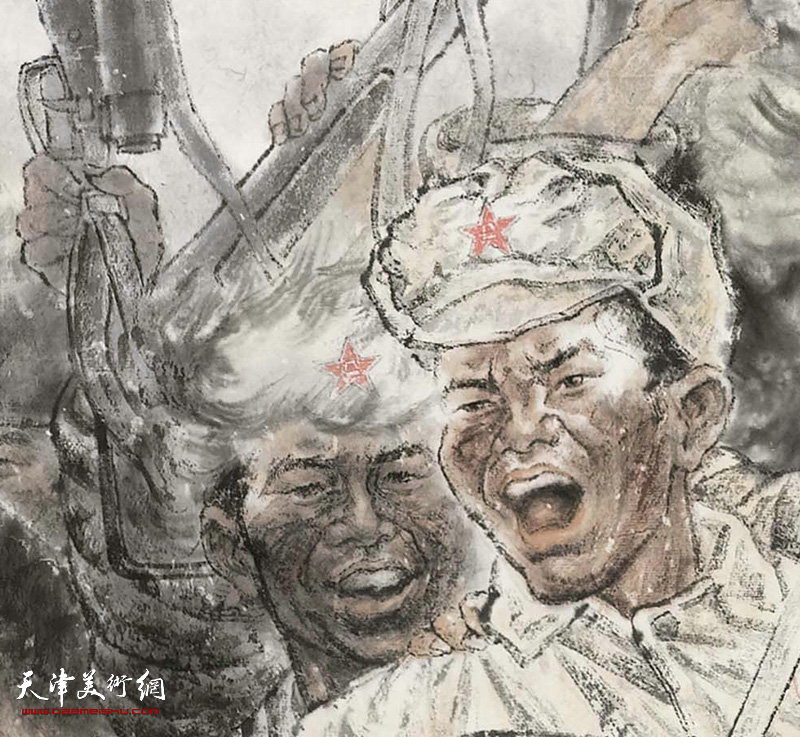 首先,创作历史战争中的一场重大战役,如何能够将“战争”这种特定的场面表现出来,尤其是落在“解放”这一点上,并不是件容易的事。因为,作为特定的历史,作为特定的内容,特定的题材是不能脱离“解放天津”这个已经规定好的范围去凭想象创作。不论这场战争的意义大小,都已经成为历史,作为当代的美术创作者,只能通过文字资料或者有限的图像资料去了解这场战争,即使是有很详尽的介绍,也不能直接拿来进行复制,因为毕竟用绘画形式来表现有其特定的要求和审美。如果不能将“解放天津”这个特定的内容形象、生动,极富感染力的表现出来,就没有太大价值。