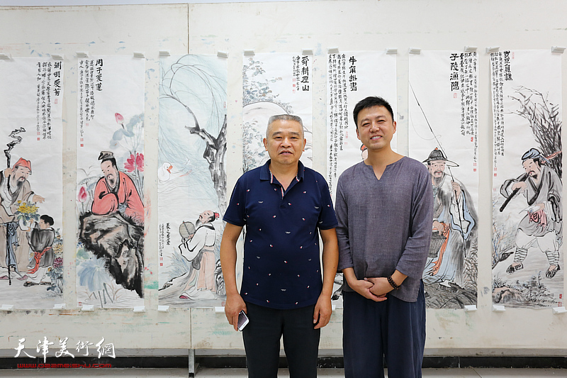 韩金山与林德谦在作品“君子四爱、高士四隐”前。