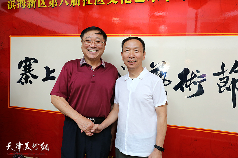 滨海新区人大副主任、区推进北部南部地区发展工作领导小组副组长郭志寅,滨海新区文化和旅游局局长王会臣,中国书法家协会副主席、天津市书法家协会主席张建会,中国楹联学会副会长、天津市楹联学会会长陈伟明,天津市书法家协会第三届主席、著名书法家、诗联家唐云来,滨海新区文化和旅游局副局长贺淑荣、祁乐荣,天津市文联原办公室主任杨跃华,天津市书法家协会副主席、静海区书法家协会主席李锋,天津市书法家协会副主席、滨海新区书法家协会主席郝军,天津市书法家协会原秘书长冉繁英,天津市书法家协会秘书长杨健君,著名摄影家,天津市文化旅游摄影家协会执行主席段铁军,寨上街工委副书记、街道办事处主任周保峰,寨上街人大主任白学军,寨上街办事处副主任王磊、谈科,滨海新区文化馆馆长田宝荣,中国书画报社党工办主任马江红,原静海区委宣传部常务副部长、静海区书法家协会名誉主席邢才芝,静海区书法家协会秘书长于浩泳,天津市书协刻字委员会主任张广金,滨海新区作协主席李子胜,中国硬笔书法协会天津工委常务主席、天津市楹联学会副秘书长王宝忠,野草诗社常务副理事长、德谦文化董事长林德谦,天宝斋石建华,野草诗社副理事长李映川,唐云来艺术馆馆长唐云先,滨海新区书协副秘书长唐广杰,工商银行保税区副行长贾立华,以及寨上街传统文化传播志愿者、书画爱好者、居民代表等参加了开幕活动。开幕仪式由寨上街办事处副主任王磊主持。