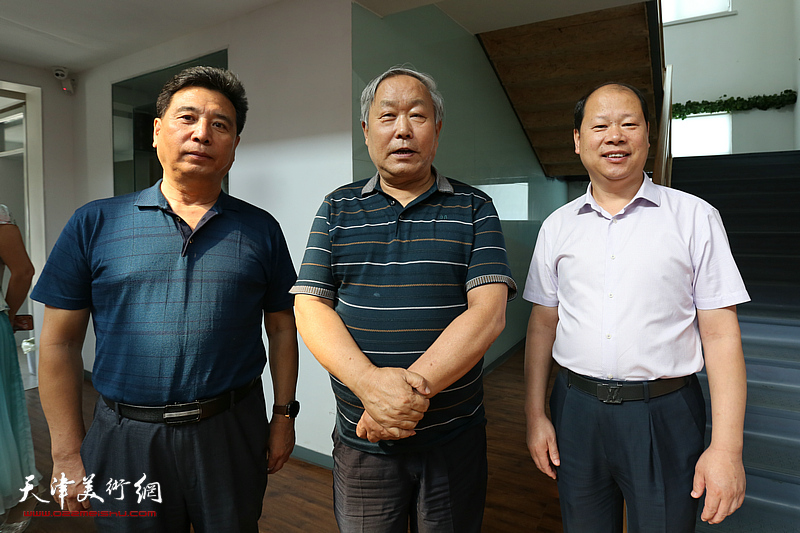 滨海新区人大副主任、区推进北部南部地区发展工作领导小组副组长郭志寅为参加“津门名家书画作品展”作者代表冉繁英、张广金颁发收藏证书。
