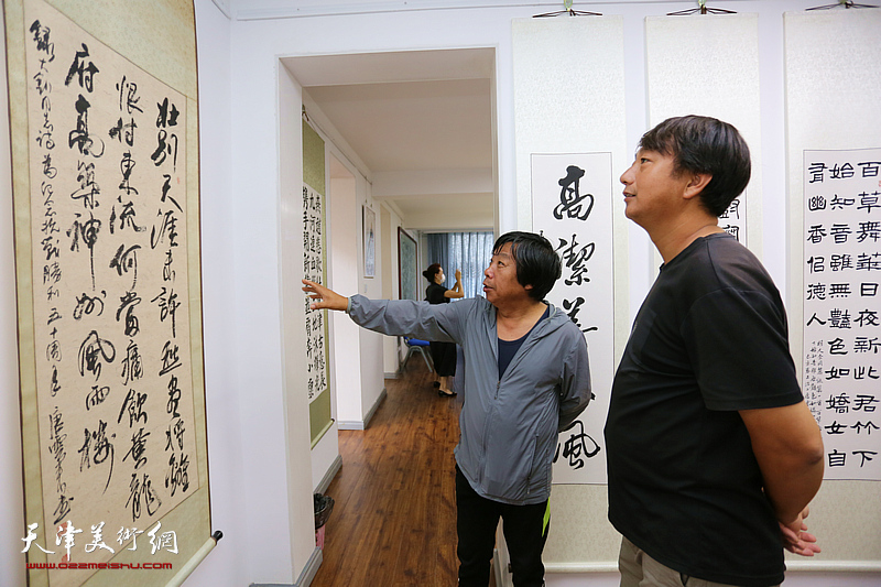 王会臣、郝军在唐云来艺术馆观看书法作品。