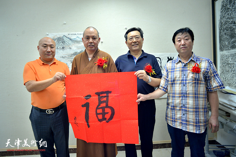 左起:吴智国、延参法师、张霁星、刘胜洋在朝华园南开画院活动中心。
