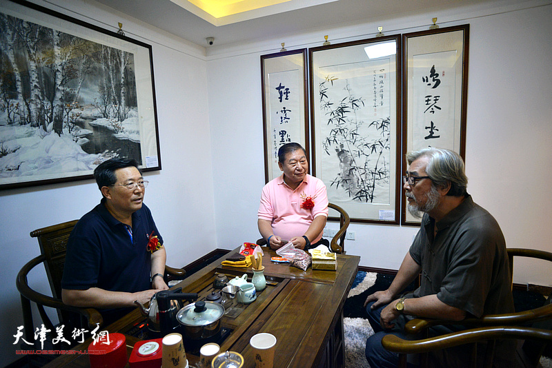 纪振民、姬俊尧、邢立宏在朝华园南开画院活动中心交流。