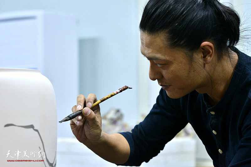 史振岭、张晓琎、刘义军在天津同飞书画院画青花瓷。