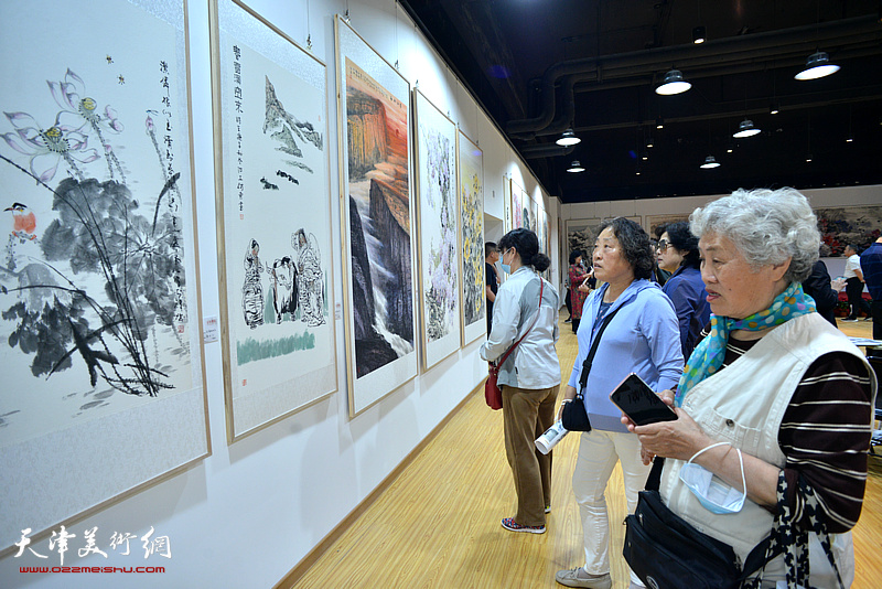 曹秀荣、王建涛、王如意、郭凤祥、耿存良、李国英在展览现场观看作品。