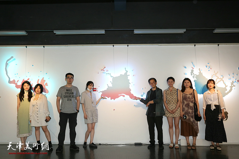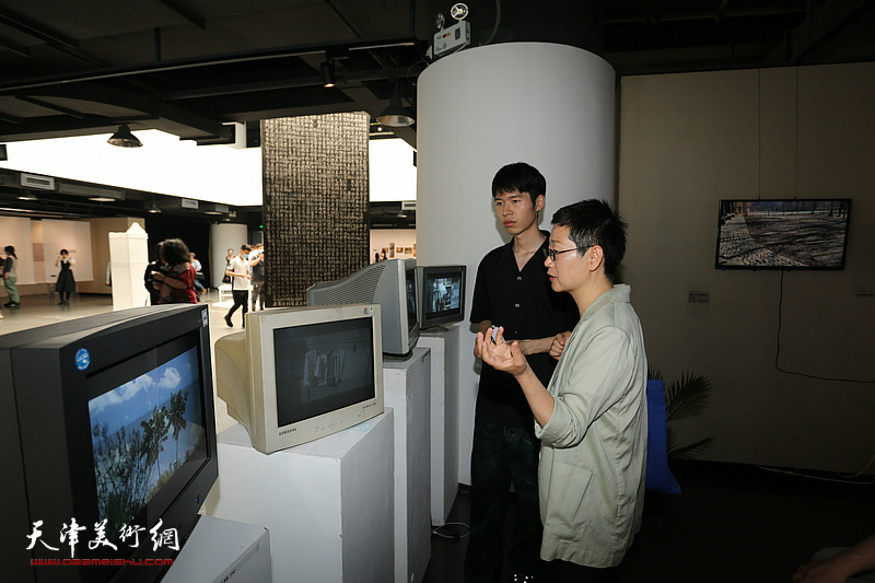 天津美术学院实验艺术学院副院长王爱君与学生在展览现场。