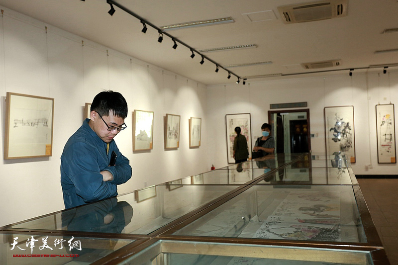 徐培晨、冯健与美术爱好者在画展现场观看作品。