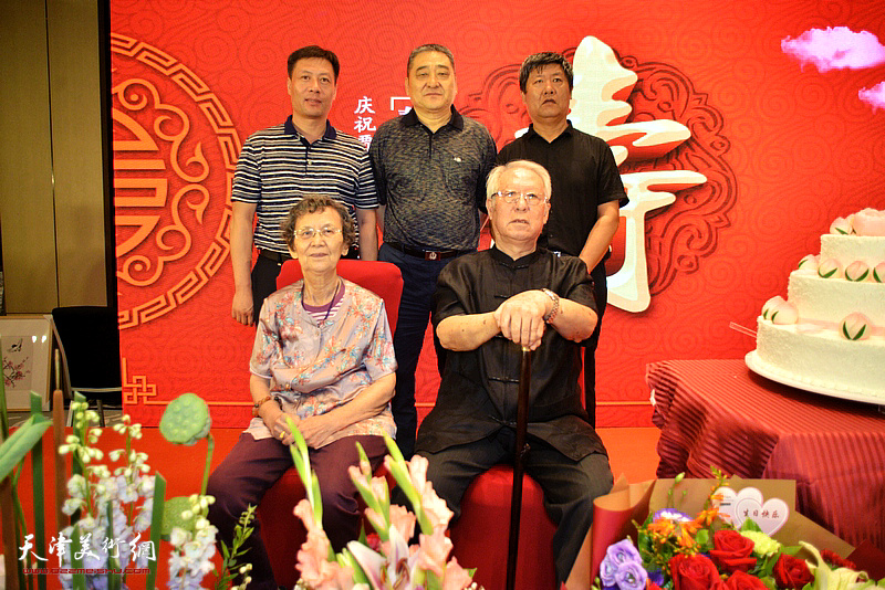 著名画家贾宝珉教授、夫人夏慧敏与书画家们在庆贺八十寿诞活动现场。