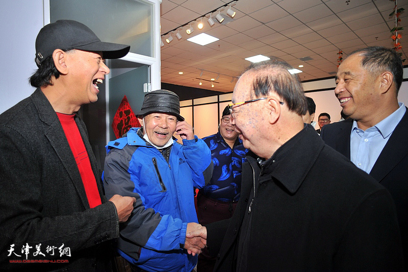 罗澍伟、史树海、李新明与烙画葫芦作者在布展现场交流。