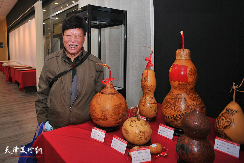 李新明与烙画葫芦作者在布展现场。