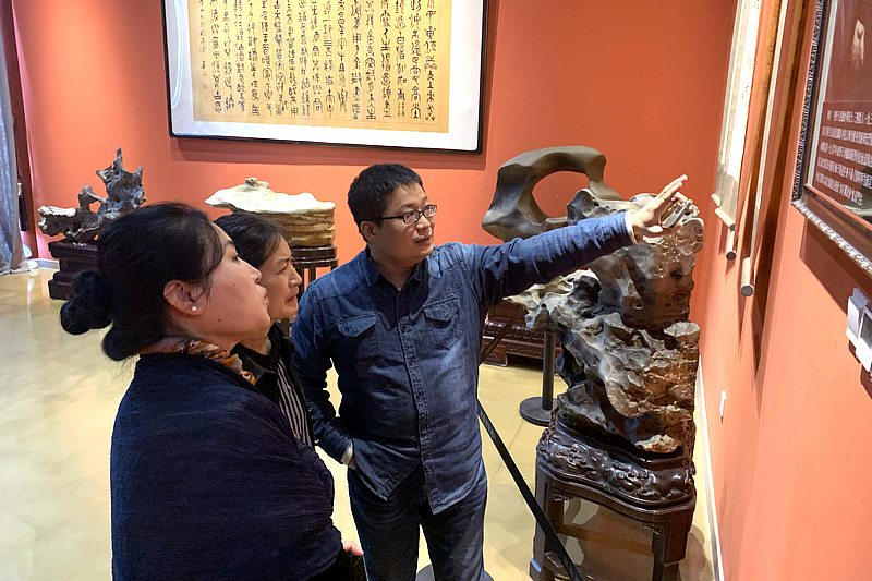 陈启智、刘栋、曹恩祥陪同华非先生观看展品。