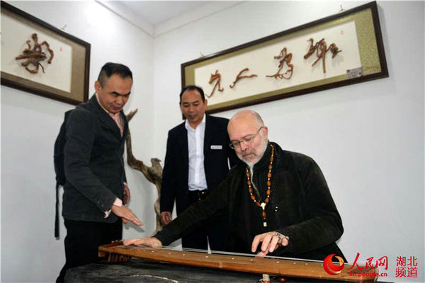 法国版画艺术家马克-布鲁尼-梅斯塔斯(右)在湖北省宜昌市夷陵博物馆中法版画艺术交流会上感受中国古琴音乐。