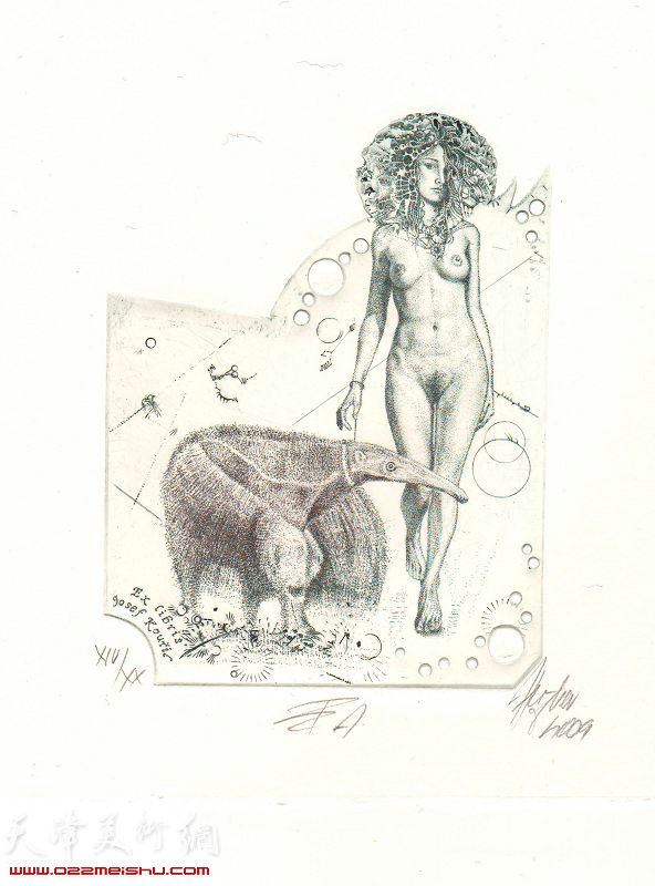 此次展览的主要内容是捷克版画名家冈特·胡博的130余件版画藏书票代表作。他的作品细腻、清新,人体和自然是艺术家创作的主要题材和灵感来源,诗歌和文学作品也是冈特创作不可或缺的灵感来源。铜版干刻技法是艺术家创作的主要技法,冈特使用的铜版不同与其他艺术家,他会根据画面需要对铜版进行磨光、打孔等特殊处理,使画面更具有冲击力和形式变化。他想象力丰富,作品的表现上,穿越时间和空间,将过去、现在、未来,人与自然、宇宙以不同的视觉符号和形象,自由、和谐地表现出来,给人以超现实和梦幻的感觉。在创作过程中,艺术家随性创作,灵感源源不断地迸发出来,在作品呈现各种变化,精益求精,令人叹服。