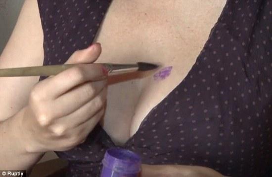 伊莉娜先将水彩颜料用画笔涂在左侧的乳房,之后再将画纸压在乳房上,让颜料染在纸上,再藉此形构成图像。