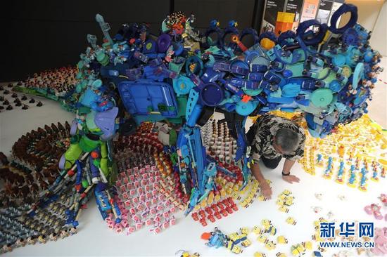 天津美术网讯 6月10日,日本艺术家藤浩志在新加坡国家博物馆布置作品《Toysaurse》。当日,日本艺术家藤浩志的作品《Toysaurse》在新加坡国家博物馆举行的儿童季展出。(邓智炜摄)