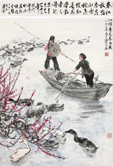 黄胄先生是新中国绘画的重要开拓者,是中国水墨人物画发展史上一个里程碑。他认为国画家在生活中直接用毛笔搜集素材,才能与国画的笔墨功夫结合得更好。黄胄以大批新意境、新技艺,展示出笔墨流畅、气度澎湃的佳作,给中国画坛做了一代新的典范。本作品正是黄胄先生的代表之作。画面构图巧妙,近实远虚,将画面无限延伸。设色考究,黑、白、灰三色调稳重融合,把杏花粉衣衬托出来,给画面赋予了勃勃生机。所画鸭子俯头前游,格外生动。人物的表现上运用速写的表现手法来抓住人物特征,线条流畅有力,造型严谨生动,生活气息浓郁。画题:“江畔杏花春雨后,一九七三年元旦黄胄画。”萧平先生题跋:“春江放鸭,杏花如雪,桃花绽红,是为劳动者之诗也。”
