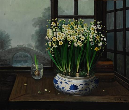 郭仁杰的《景物》则为我们描绘了舒适的室内空间,水仙花开得恣意而妖娆,透过窗户,我们看到晚归的牧牛已经荷锄而归的农人。一切都那么恬淡与静谧,犹如河水,静静地流淌。