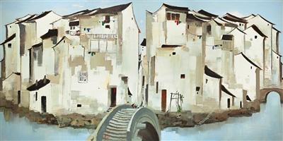 而出生于江苏宜兴的吴冠中,自幼即对江南古镇周庄心向往之。此次展出的《周庄》(150cm×300cm)以黑、白、灰为主的极简色彩与点、线、面元素组成,也是吴冠中美术馆级别最大尺幅的油画。