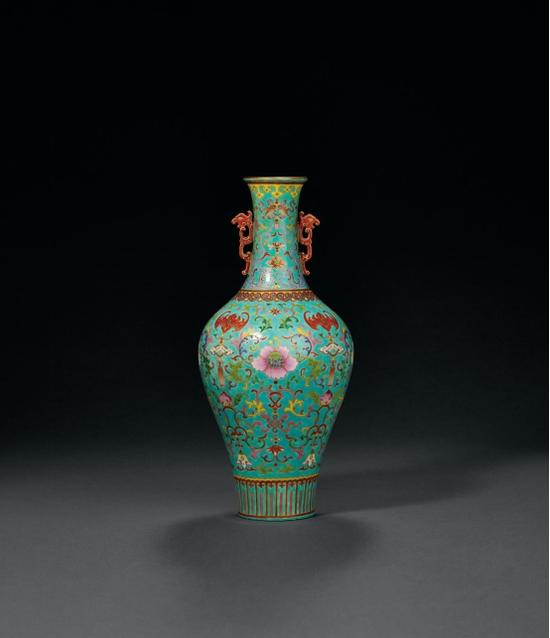 单色釉品种亦不遑多让。清康熙白釉团螭纹太白尊,外壁凸饰三组团螭,品相保存良好,为康熙时期名贵的文房用品。清乾隆窑变釉梅瓶,肩部丰满,外壁呈色紫红,蓝色垂淌偶见其间,如映日霞光,为乾隆宫廷的陈设用器。