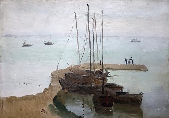 这件作品描绘了一幅典型的江南风景。近景是六只停泊在江边的渔船,两只与画家视线一致,另外四只则平行于横向的画面。沙滩蜿蜒伸向江中,如一只胳臂将停泊的渔船揽入怀里。江面占据画面的大部分,偏绿的水面与略紫的天空由隐约的远山或横桥连接起来。江上由近及远点缀着三只劳作的渔船,更远处则是数点白帆。画家在简洁的画面中力图营造精致的氛围。泊船浓淡相间的长长桅杆、随风飘扬的绳索、在空隙中精心点出的白帆,以及富于对比的笔触,使画面清新自然,耐人寻味。