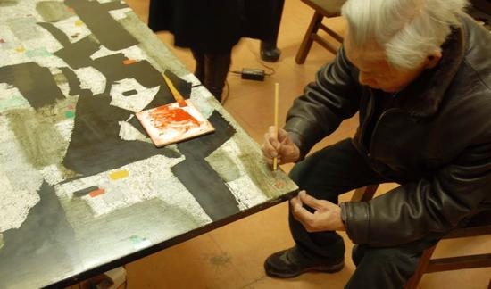 乔:吴冠中先生对漆画特别感兴趣,对漆画的制作繁复的手段很佩服。别人对漆画中镶嵌的白,认为是一点点上去的,其实是不同颜色的蛋壳镶嵌进去的,就像是梵高画中的点彩,很有力度,表现力很强。他很好奇大漆干后颜色会有变化,大漆是棕红色的,时间一长氧化后变为深棕色、黑色,过段时间会返回来接近原色。漆的制作手段有很多,预埋、罩髹、研磨等,他对这样的技法十分喜爱。