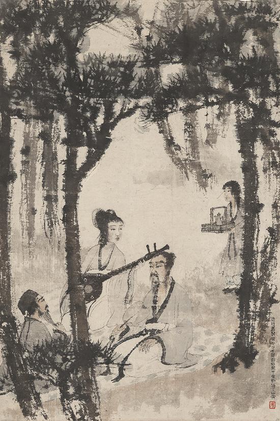画面右下方沿边作方笔篆书款:“听阮图,癸未九月下浣,抱石写于金刚坡山斋。”癸未为纪元1943年,其时,抱石先生居重庆西郊金刚坡已四年,仍是其金刚坡的前期,处于艺术风格探索的阶段,故画法时有变化,画笔也时带生拙感。所用纸张,属蜀中土制皮纸,质地粗且松,极易渗墨,不易掌控。其绘画效果与宣纸有明显的差异,可以造成新鲜的感觉,这又是它的好处了。抱石先生善于“因地制宜”,他能采用不同的笔法,适应于不同的质地。此图中,松干苍老,松针苍润,苍中含着质感与力量;人物衣纹线描,细劲而率意,与松林既形成对比又和谐统一。仅在人物面部作深入之描写并敷以淡绛,突出于画面。所有这些安排,都反映着作者的匠心。