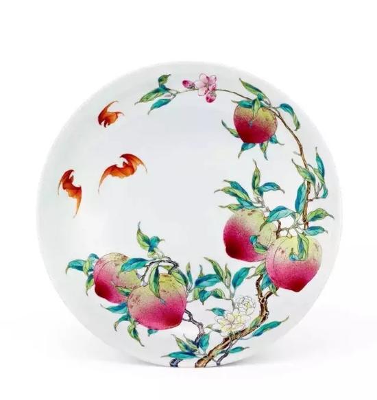 蝠桃图为清代粉彩瓷器装饰典型的吉祥图案,雍正乾隆两朝均有烧制,画意内容相同,图案寓有“蟠桃献寿”之意,但是蟠桃的数目有别,雍正器多绘八桃纹,乾隆时期常绘九桃,故有“雍八乾九”之说。八个硕桃取“八仙祝寿”之意,“蝠”与“福”谐音,五只蝙蝠装饰,寓意“五福临门”、“五蝠捧寿”之意。乾隆装饰九桃纹器物,有盘、碗、橄榄瓶、天球瓶等。装饰八桃纹的盘较为罕见,从款识写法及八桃纹饰来看,应为乾隆早年之作,即督陶官唐英任职时期烧制。此类福寿纹器应是万寿节的用品。器胎薄体轻,纹样疏密有致,敷彩新嫩,清新隽雅,纹饰绘制精工,画意生动,为乾隆粉彩器的上品。
