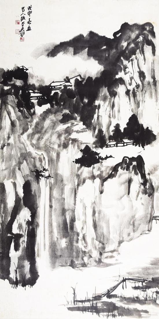 此幅《泼墨山水》是属于纯墨色泼出作品的典型代表佳作,创作于1968年,尺幅之大,技法之纯熟,使人瞠目结舌。