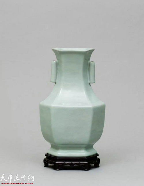 (来源:1.佳士得香港,2011年11月30日,编号3315。2.日本藏家旧藏。参阅:1、《故宫博物院藏文物珍品大系——颜色釉》,上海科学技术出版社,2009年,第226页,图204。2、清雍正,仿官釉贯耳六方瓶,见 《故宫博物院藏文物珍品全集:颜色釉》,商务印书馆,1999年,页226,图版204。3、清乾隆 天蓝六方管耳瓶,见《世界陶磁全集12 清朝篇》,座右宝刊行会编辑,河出书房发行,昭和31年(1956)8月,页183,图版46。)估价:100,000-120,000(英镑)