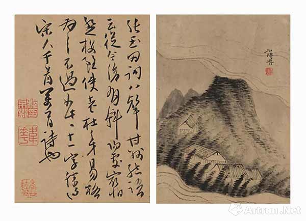 第三开构图奇迥,画溪岸边打渔之景。右下题“观志山作书有此,石涛”。钤“事菊”白文长印,此印未见于石涛他作中。对题书法云:“‘草树凄迷,江山睥睨,扣角呼牛且起。不辞努力向东郊,另辟个、桃源人世。’题李董自耕烟图《踏莎行》后半阕。”钤印:“嵯峨樵史”(朱)。词牌题者有误记,所题为先著《劝影堂词》中的《鹊桥仙》,词的上半阙为:“院里风光,渡头烟水,五十年前仙李。老来何以事耕犂,要踏着、自家田地。”李郊,字董自,江宁人,时居金陵,与先著等相善,工山水。