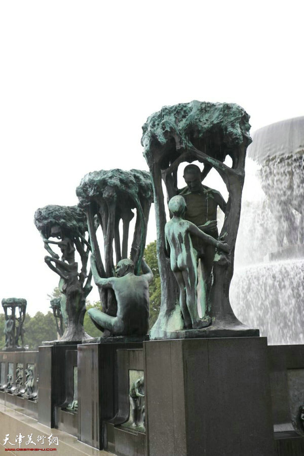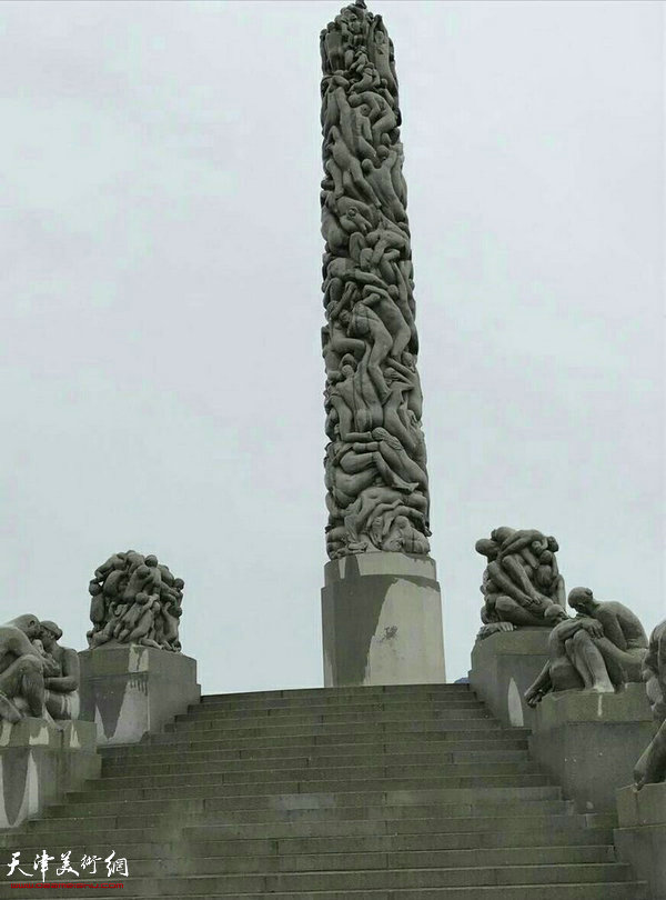 维格朗雕刻公园有192座雕塑,总计有650个人物雕像。这些由铜、铁和花岗石制成的雕像,是维格兰20多年心血的结晶。公园内虽然雕像比比皆是,但是多而不乱,错落有致。园里有一条长达850 米的中轴线,正门、石桥、喷泉、圆台阶、生死柱都位于轴线上,主要雕像、浮雕分布其间。石桥两侧各有 29 座彼此对称的铜雕。喷泉四角,各有5 幅树丛雕,四壁为浮雕,中央是托盘群雕。圆台阶周围是匀称的 36 座花岗岩石雕,中央高耸着生死柱。全部雕像,形成几幅美丽的几何图案,匀称和谐,浑然一体。公园里所有雕像的中心思想,集中突出一个主题——人的生与死。如喷泉四壁的浮雕,从婴儿出世开始,经过童年、少年、青年、壮年、老年,直到死亡,反映人生的全过程。而四角的树丛雕,一角是天真活泼的儿童,一角是情思奔放的青年,一角是劳累艰苦的壮年,一角是垂暮临终的老年,组成人生的 4 幅画面。圆台阶的 36 座石雕,也是从婴儿出生开始的,游人依次环行,渐渐看到人生各个时期的形象:孩子们在捉迷藏,少年们在扭打玩耍,情人在窃窃私语,老人们熬度暮年,环绕一周,到第 36 座死亡球塔为止。石桥两边的护栏上,安放着反映日常生活的 58 座青铜雕像,塑造了许多青年男女和儿童。体格雄健的男子、绰约多姿的少女和纯真无邪的儿童组成了大组群雕。它们有的在尽情地跳舞,有的在谈情说爱,也有丈夫打骂妻子儿女的……维格兰在这组雕像群中,穿插了一个新的主题思想——父亲与孩子们在一起。相传 20 世纪初期,在西方男人们的心目中,料理家务、养儿育女和经营“后方”乃是妻子们的事。他们一方面向往成家立业,另一方面却又不甘心陷入家庭生活的网套。他们厌烦婚后的生活,企图挣脱妻子儿女们的纠缠。但现实生活像一团团乱麻,剪不断,理还乱,将他们和家人盘绕在一起。最引人注目的是一尊嚎啕大哭的小男孩雕像,只见他跺着双脚,挥动着胳膊,仿佛寻求父母之爱。圆台阶中心的生死柱,无论在艺术技巧上,或是思想内容上,都算得上园中具有代表性的杰作。它是维格兰花费 14 年心血雕成的。石柱高达 17 米,周围上下刻满了 121 个裸体男女浮雕。柱上死者惨相目不忍睹,有夭折的婴儿,不幸的青年,披头散发的妇女,骨瘦如柴的老人。这根“生死柱”描绘了世人不满于人间生活而向“天堂”攀登时,相互倾轧和相互扶掖的情景。人们有的沉迷,有的警醒,有的挣扎,有的绝望,组成了一个陡峭上升的旋律,令人惊叹不止。(百度百科)